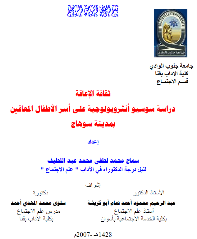 ثقافة الإعاقة دراسة سوسيو أنثروبولوجية على أسر الأطفال المعاقين بمدينة سوهاج
